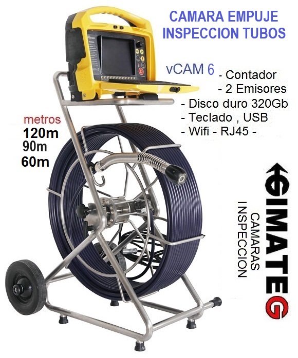 Camara empuje 46mm HD profesional sonda empuje 60 metros ,para inspeccion de tuberias (entre aprox >DN100 a DN300) .Cabeza camara 46mm acero inox con lente safiro (max 10 Bar) autonivelante LEDs ,Resolucion 1080p ,Visión 96º ,carrete con ruedes con sonda empuje 60 metros , Emisor STD 512Hz+33kHz ,contador metros , TFT color grabacion HD en DiscoDuro ,USB, Tarjeta, TECLADO, Bateria aprox 5 horas. Opciones= Guia y LEDs para tubo