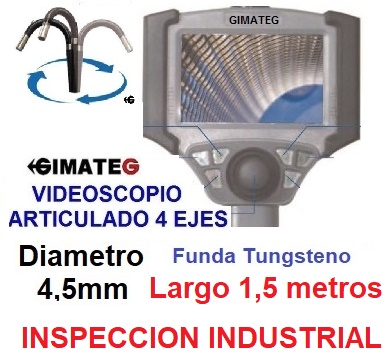 Videoscopio industrial, diametro 4,5mm largo 1,5 metros flexible funda Tungsteno ,articulado 4 ejes 360º con MOTOR ,pantalla color 4,3" 1024x768 ,Graba foto JPG 1024 y video AVI 720 en tarjeta SD,peso 960gr ,maleta , Bateria Litio