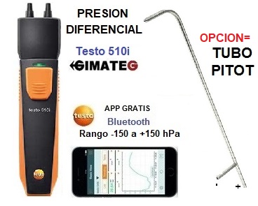 Medidor conexion Bluetooth a MOVIL de Presion diferencial , SIN Pantalla ( APP Gratis TestoSmart ) OPCION = Tubo Pitot acero 500mm